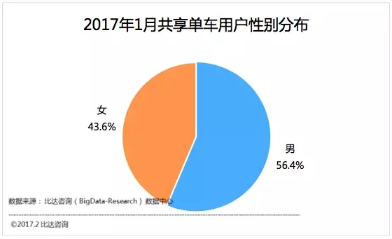 2017年1月共享單車(chē)用戶(hù)性別分布,男性占56.4%,女性占43.6%。