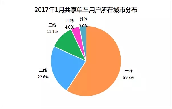 2017年1月共享單車(chē)用戶(hù)所在城市分布方便, 用戶(hù)多集中在一線(xiàn)城市中,一線(xiàn)城市占59.3%;二線(xiàn)城市占22.6%;三線(xiàn)城市占11.1%。