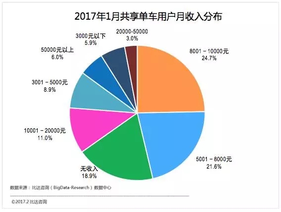 2017年1月共享單車(chē)用戶(hù)月收入分布方面, 8001元至10000萬(wàn)占比最多,達(dá)24.7%;5001至8000元占21.6%;無(wú)收入人群多為學(xué)生群體,占18.9%。