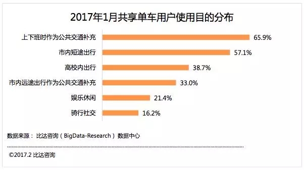 2017年1月共享單車(chē)用戶(hù)使用目的分布,上下班通勤作為交通補(bǔ)充最多,達(dá)65.9%;市內(nèi)短途出行為57.1%;高校內(nèi)出行38.7%。