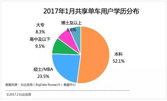 2017年1月共享單車(chē)用戶(hù)學(xué)歷分布方面,本科占比最多,達(dá)52.1%;碩士/mba占23.5%;高中及以下占9.5%。