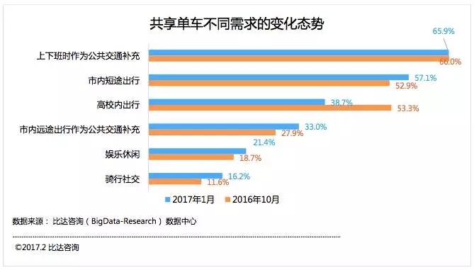 2017年1月共享單車(chē)不同需求變化態(tài)勢(shì)分布方面,相比較于2016年10月,高校內(nèi)出行由上半年的53,3%降至38.7%。而上下班作為交通補(bǔ)充,市內(nèi)短途出行比例變化不大。