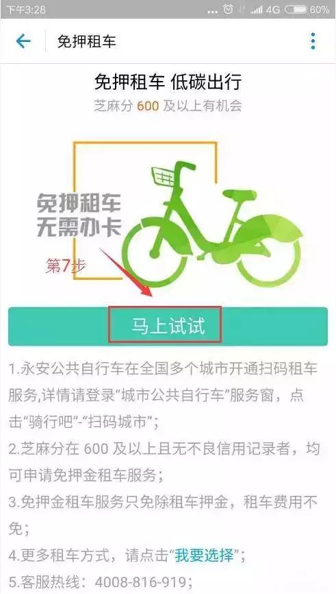 7、果然,芝麻分在600分及以上才可以使用。點(diǎn)擊“馬上試試”,下面就正式進(jìn)入租車的步驟啦!