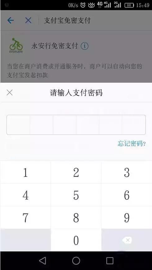 會(huì)出現(xiàn)一個(gè)設(shè)置支付密碼的界面。這是為了確保超過1小時(shí)后,, , 公共自行車向支付寶發(fā)起自動(dòng)扣費(fèi)。正常填寫就好。