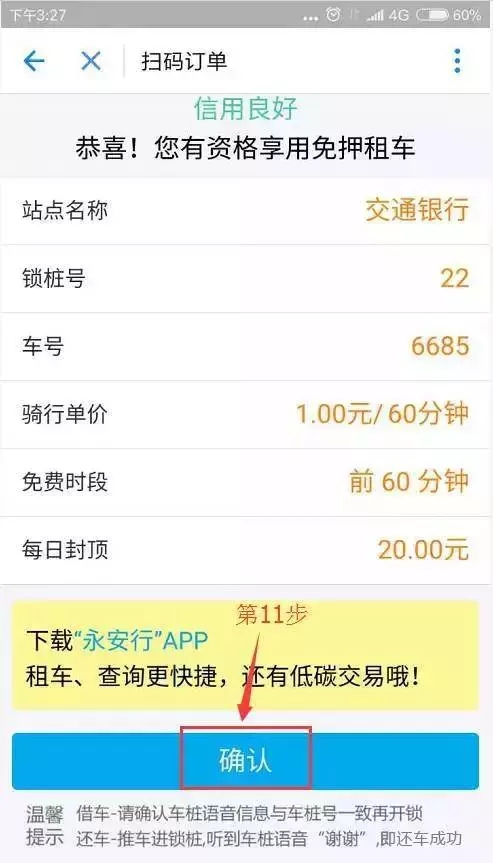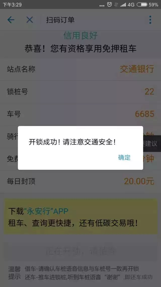 9、填寫好支付密碼后,跳轉(zhuǎn)的界面上,我們可以看到上面有站點(diǎn)名稱、鎖樁號、車號、騎行單價(jià)、免費(fèi)時(shí)段以及每日封頂。